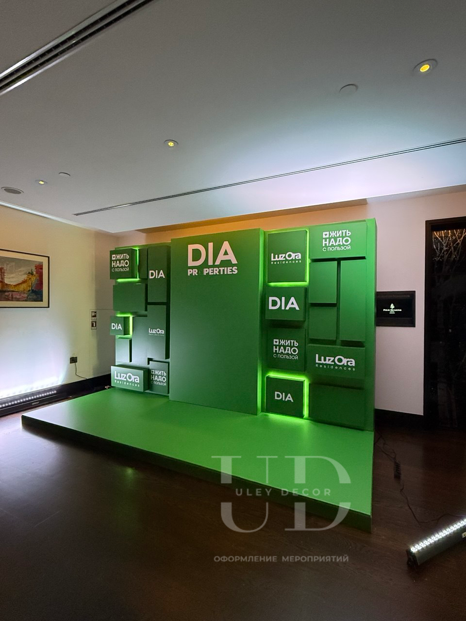 Фотозона в фирменном цвете с логотипом из премиального золотого пластика.